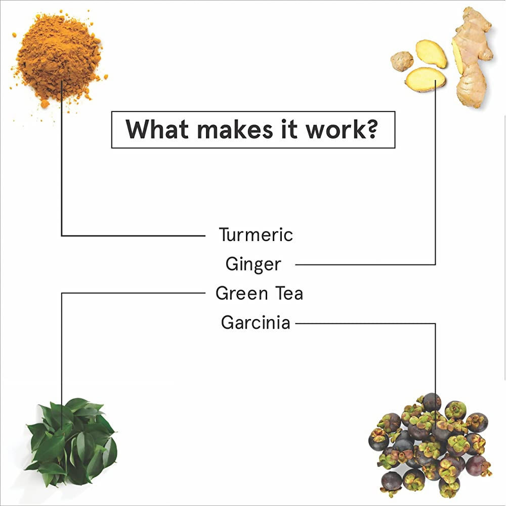 - Green Tea, Garcinia, Apple, Mango, Strawberry, Ginger, Turmeric, Sweetener
