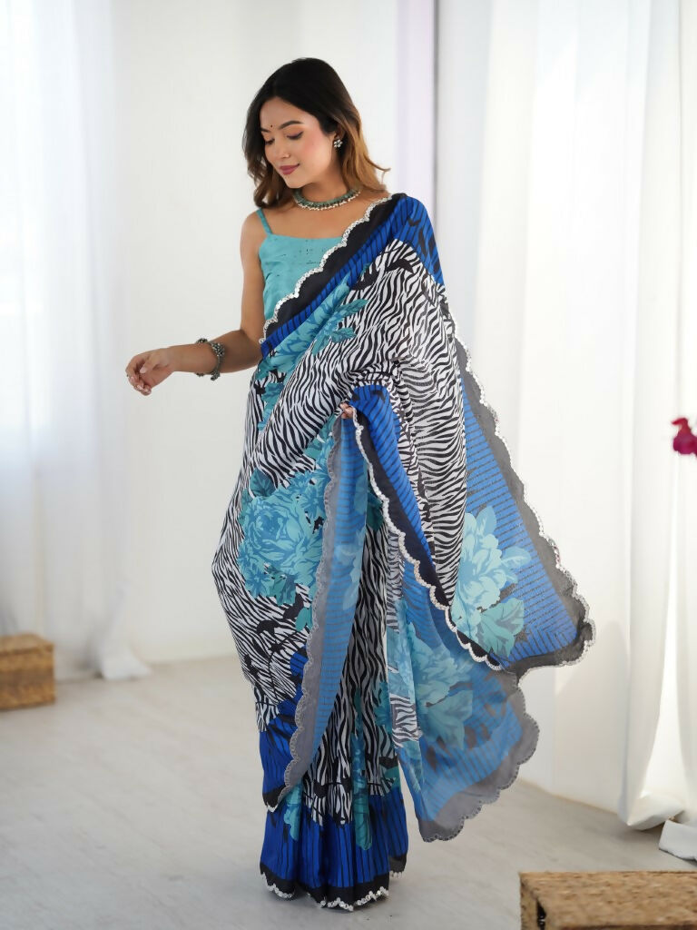 Blue Chinon Designer Digital Printed,Mirror Cut Work Saree - Manvika