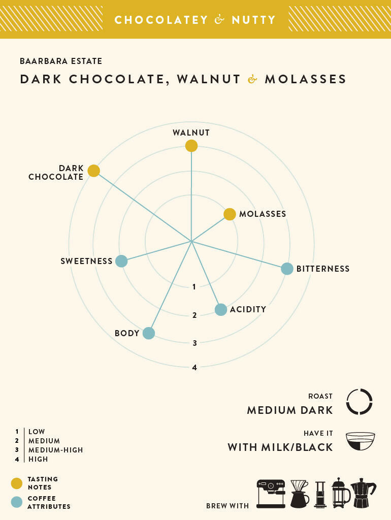 - Our medium dark coffee from Baarbara Estate has a wonderful aroma of sweet caramel and dried apricot. We love this coffee’s intense, chocolatey flavour profile. To taste the syrupy, smooth mouthfeel of this coffee, we recommend brewing it as a Pour Over, an Espresso or using an Aeropress, Moka Pot or a French Press. If you’ve enjoyed our coffees from Attikan Estate and Sandalwood Estate, you’ll appreciate the sweet aftertaste and medium acidity of this heavy bodied coffee.