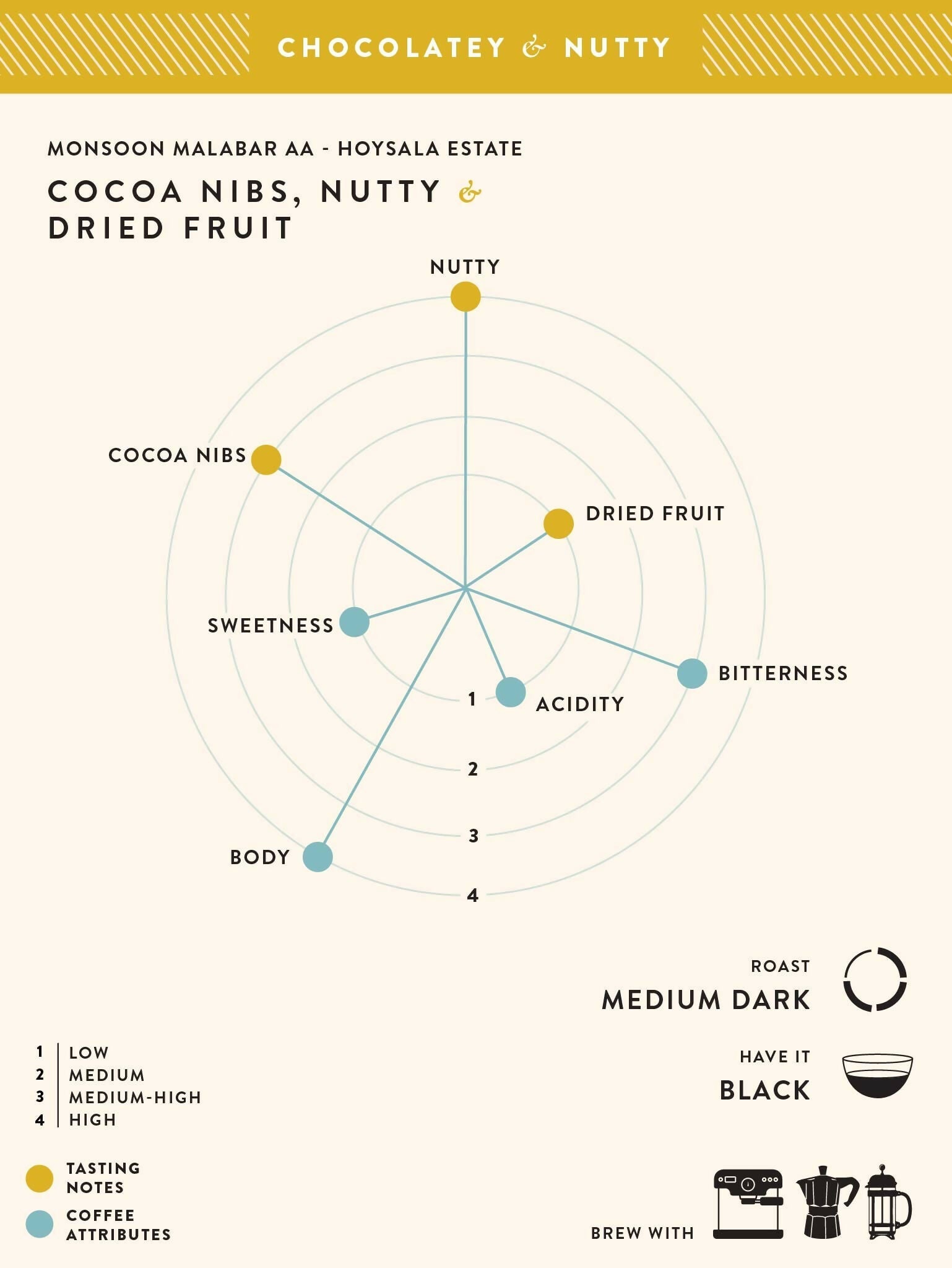 - When roasted medium dark, the result is a medium-bodied cup that invites with sweet aromas of butter biscuits, you to notes of cacao nibs and dried fruit, concluding with the aftertaste of dark chocolate. Best enjoyed when brewed as an espresso, in the Moka Pot or the French press, the nutty flavor profile of this coffee makes for a delicious cup, either milky or black