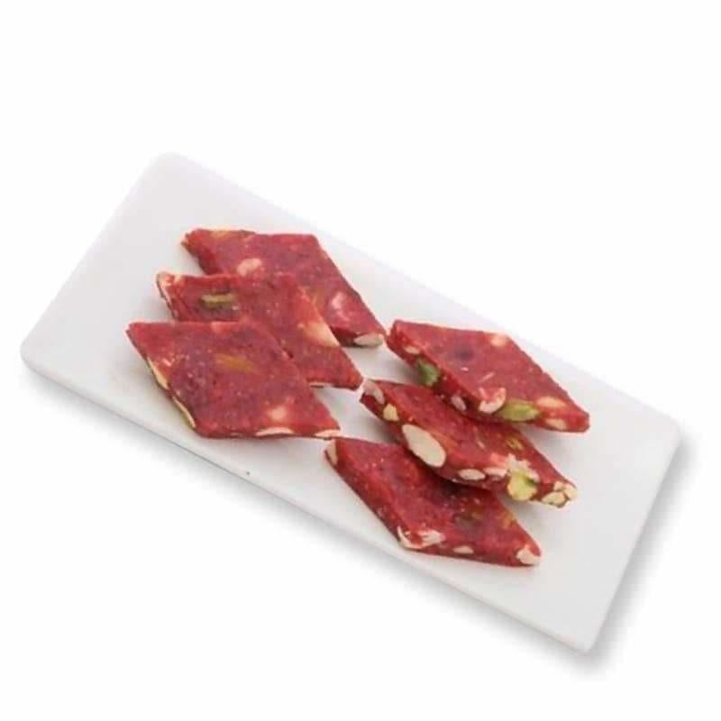 Red sliced and diamond shaped, Dadu’s Anjeer Katli is a colourful Indian dessert. These sweets are generally served on occasions like Holi, Raksha Bandhan or Diwali.