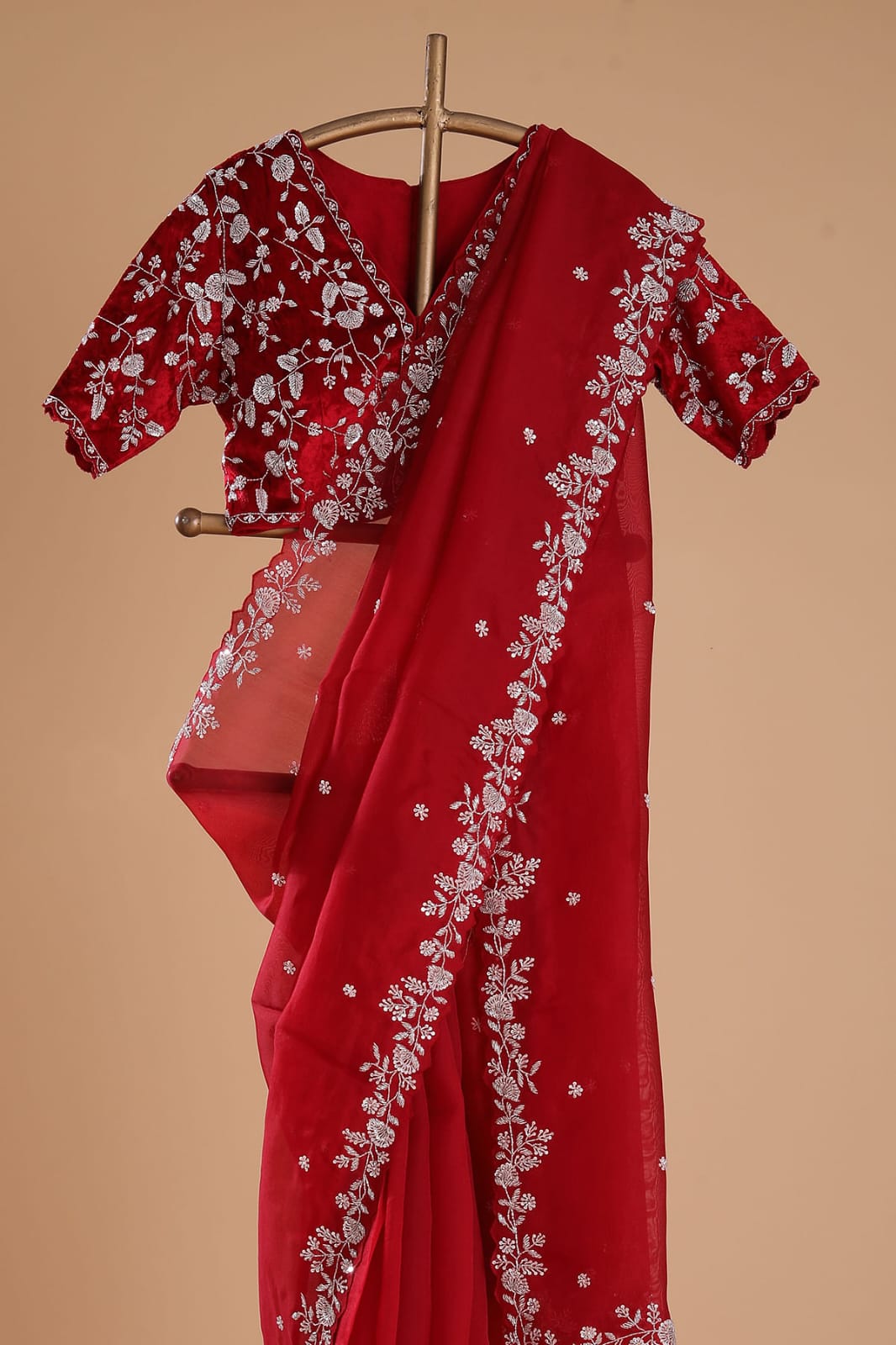 This Saree contains two types of blouses one of opera silk with jaal Handwork and 2nd is Velvet blouse with embroidery