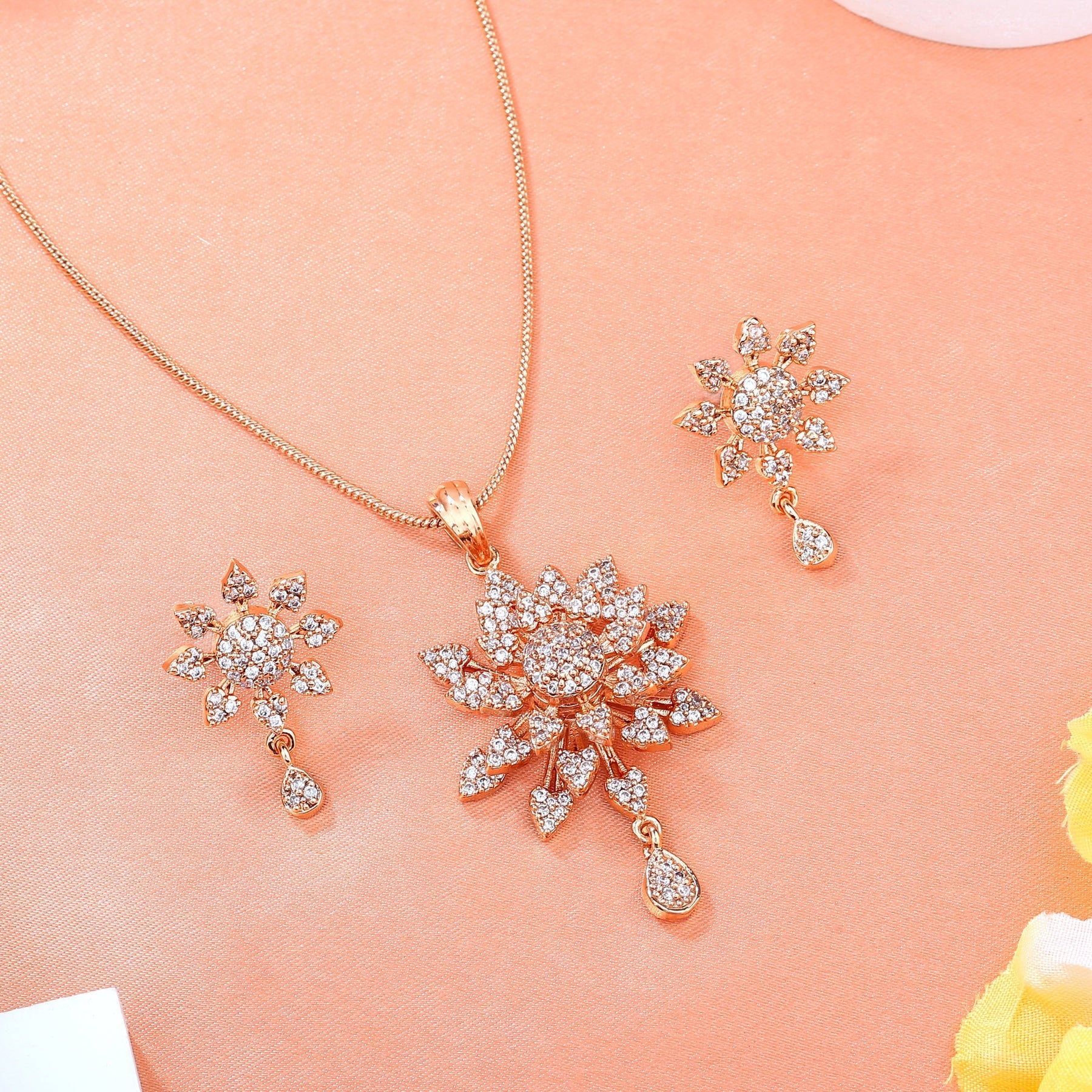 Estele Rose Gold-Polished Stunning Floral Designer Pendant Set with White American Diamonds for Girls & Women