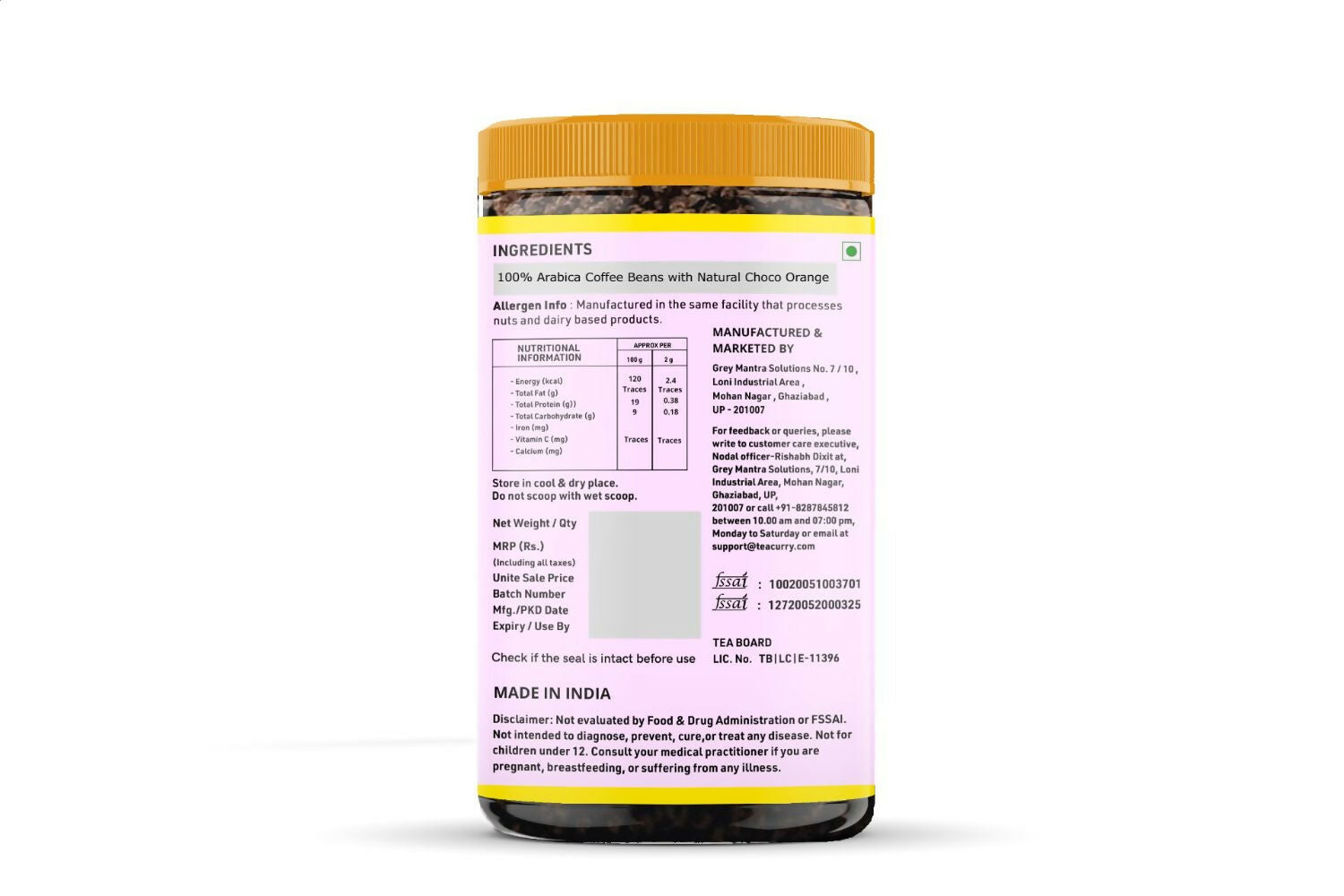 Ingredients:Teacurry choco orange coffee is made with 100% premium Arabica beans with natural orange.